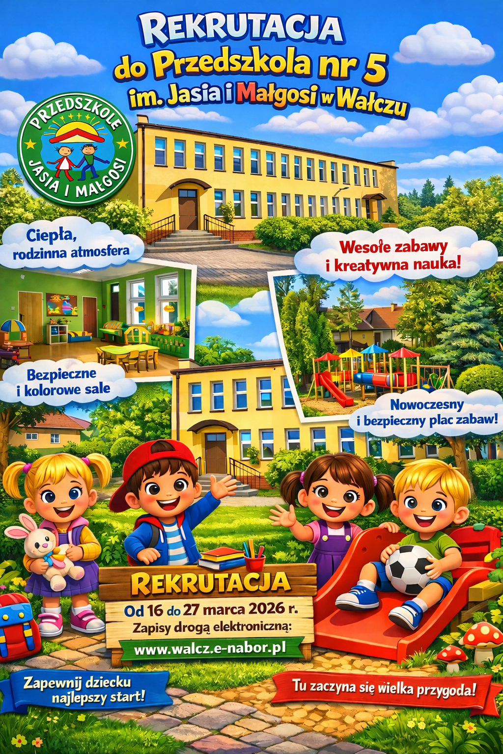 Publiczne Przedszkole nr 5 im. Jasia i Małgosi to miejsce, w którym dzieci czują się bezpiecznie, radośnie i swobodnie, a każdy dzień sprzyja odkrywaniu świata. Placówka położona jest w spokojnej części Wałcza, z dala od ruchliwych ulic, w otoczeniu zieleni i z dużym ogrodem oraz dwoma nowoczesnymi placami zabaw.